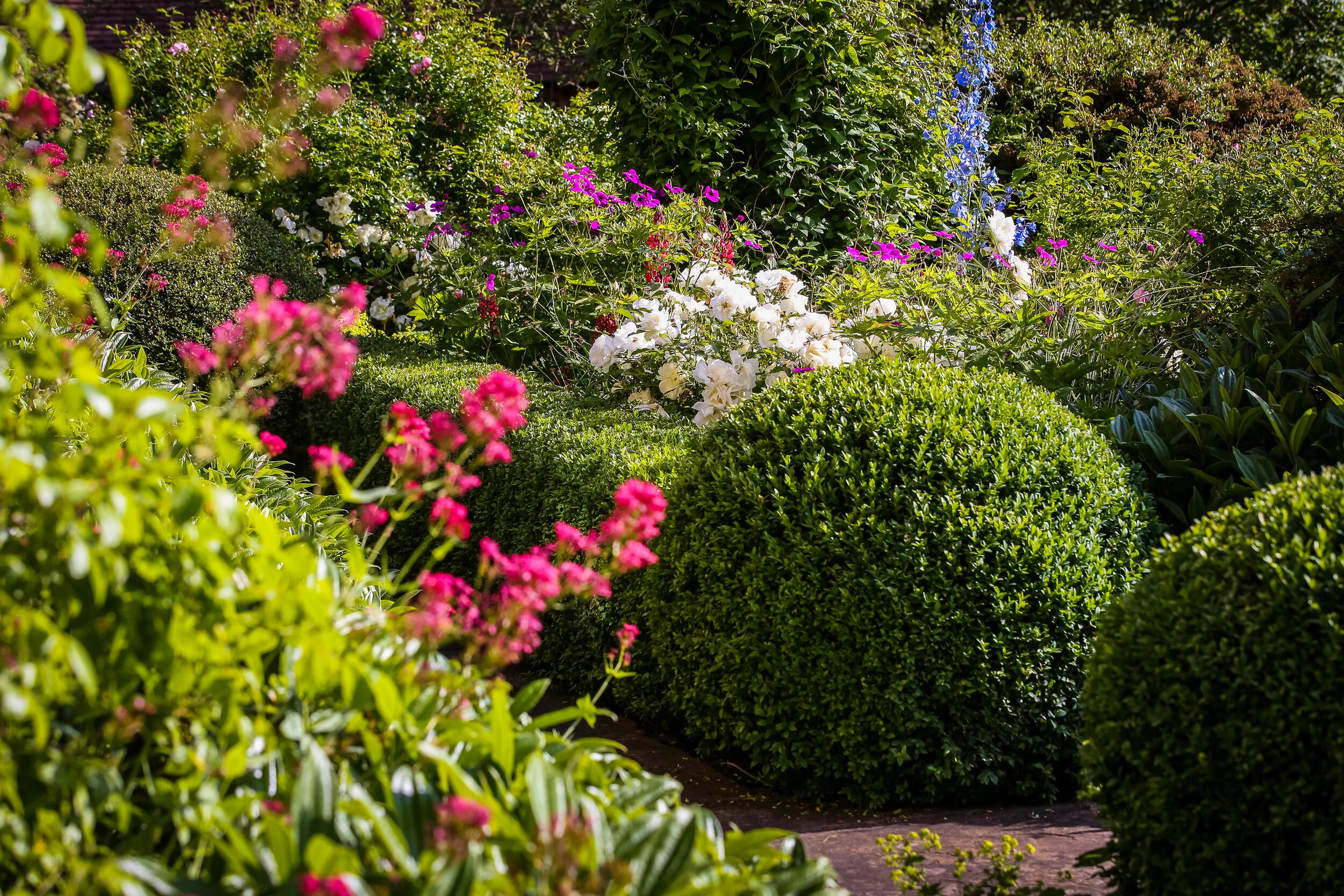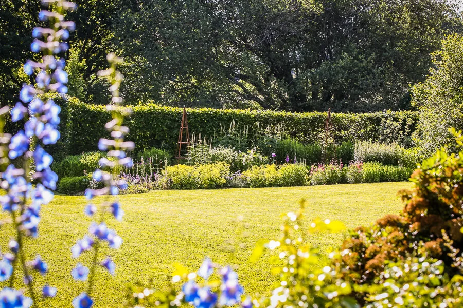 We have created two large herbaceous borders around a main lawn and have also planted an orchard which produces sensational blossom in the spring and barrow loads of fruit in the autumn. We have allowed some areas of long grass to establish to encourage wildlife, and filled many of the borders with roses which love our difficult soil.